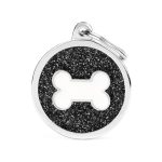 Placa pequeña en forma de círculo con purpurina negra y un hueso blanco