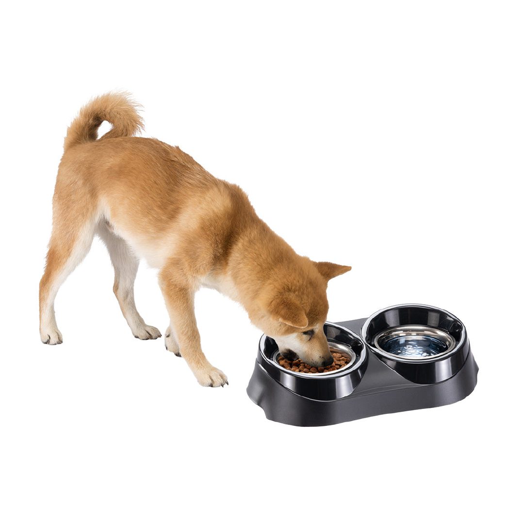Duo Feed es un bol de acero inoxidable con un soporte de plástico ideal para dar agua y comida a tu mascota de una manera simultánea e higiénica.
