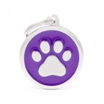 Placa Classic grande en forma de círculo morado y un pata blanca